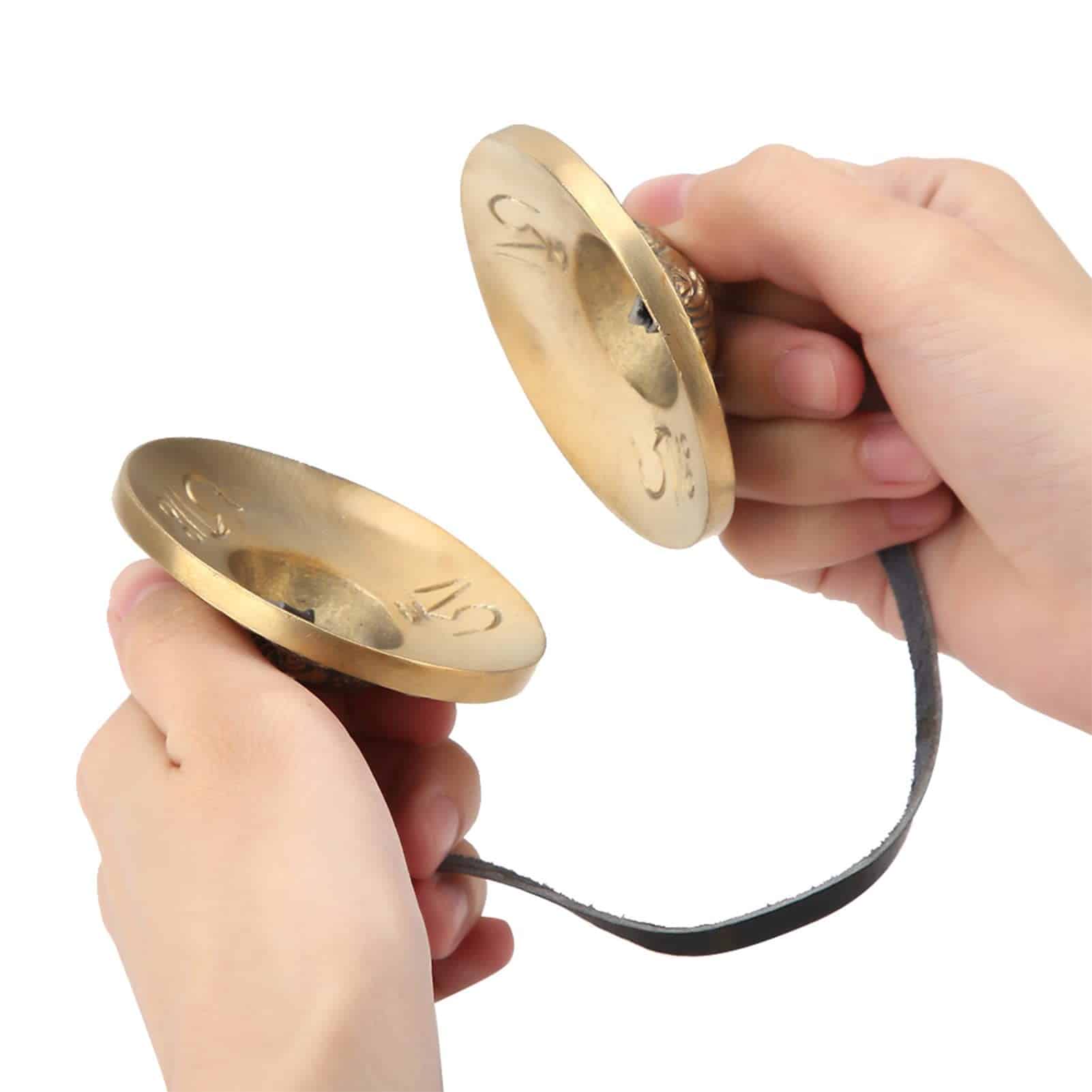 Fabriquée en laiton, elle est constituée de 2 petites cymbales bombées, reliées par un cordon noir en cuir pour une manipulation facile.